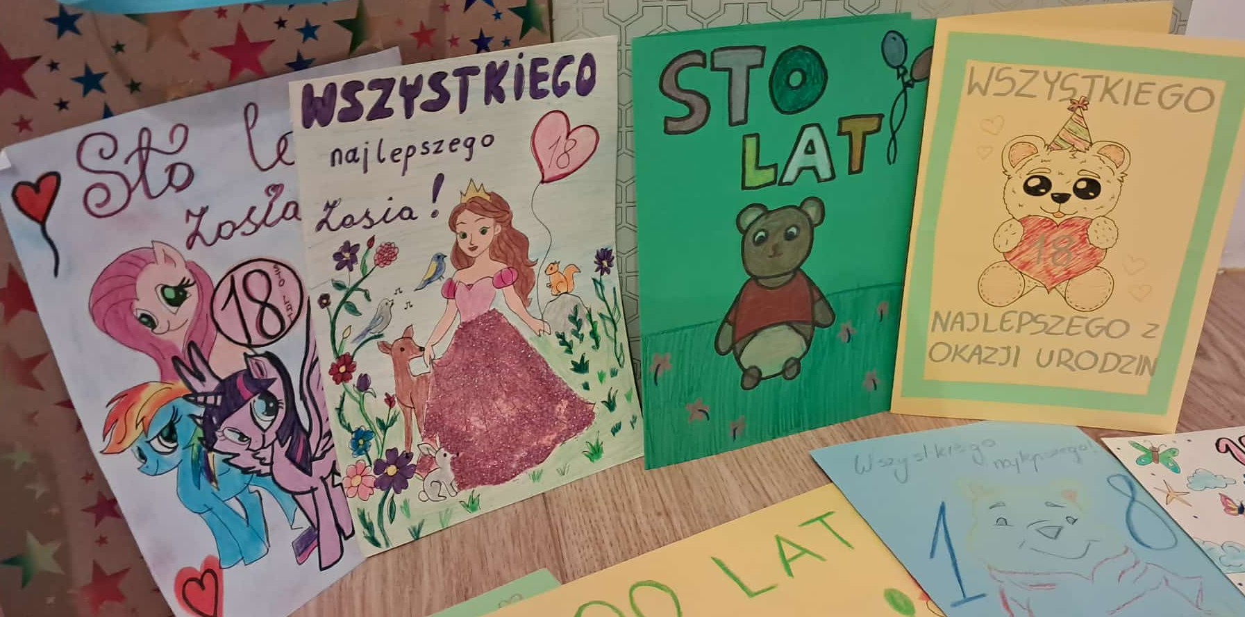 Uczniowie z zaangażowaniem i sercem tworzyli kartki, wkładając w nie mnóstwo kolorów, życzeń i dobrej energii. Dzięki ich kreatywności i empatii udało się przygotować piękny urodzinowy prezent, który sprawił Zosi wiele radości i wywołał szeroki uśmiech na jej twarzy. Zbiórka pokazała, że wspólne działanie ma ogromną moc – szczególnie wtedy, gdy celem jest wywołanie czyjegoś szczęścia.