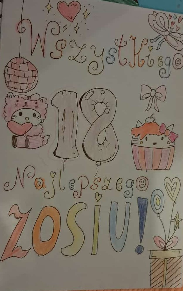 W naszej szkole zakończyła się wyjątkowa akcja przygotowywania własnoręcznie wykonanych kartek urodzinowych dla Zosi, która wkrótce obchodzi swoje 18. urodziny. Choć osiąga symboliczny próg dorosłości, Zosia pozostaje niezwykle wrażliwą i pełną dziecięcej radości dziewczynką. Jej rozwój emocjonalny i intelektualny przypomina kilkuletnie dziecko, dzięki czemu każdy drobny gest wywołuje u niej ogromny entuzjazm.