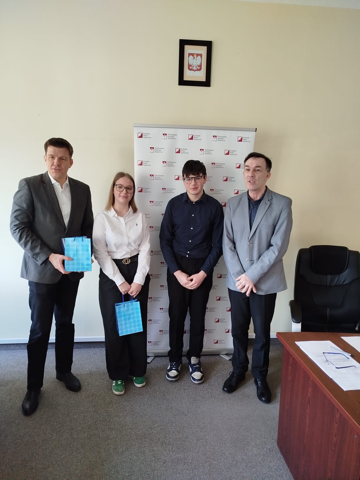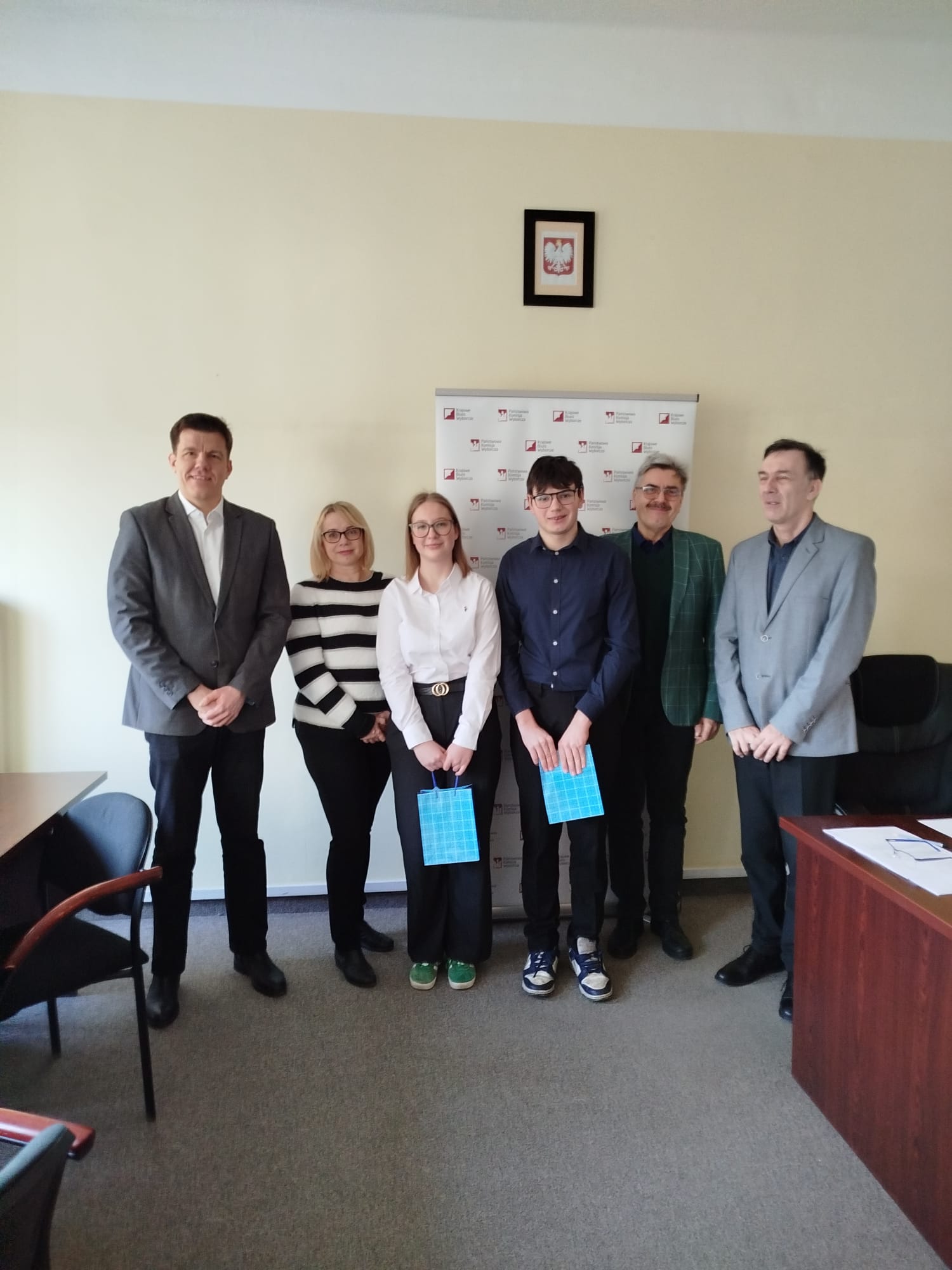 Na zdjęciu komisarz wyborczy, przedstawiciele konkurencji IX LO, dyrektor Państwowego Biura Wyborczego.